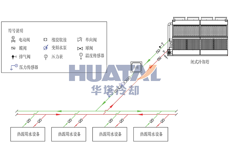 在工業(yè)水冷卻系統(tǒng)中,用戶使用場景往往會出現多個用水點,且不同時使用的情況,在用水量大的時間段,供水不足且水壓下降;在部分設備不用水時,水泵定速運行,不僅造成電能的浪費,而且由于泵長期高速運行,易使軸承損壞,影響泵的使用壽命,且備用水泵出現過銹死的現象。華塔冷卻在此基礎上開發(fā)出恒壓變頻閉式冷卻塔系統(tǒng),恒壓供水節(jié)約耗能。